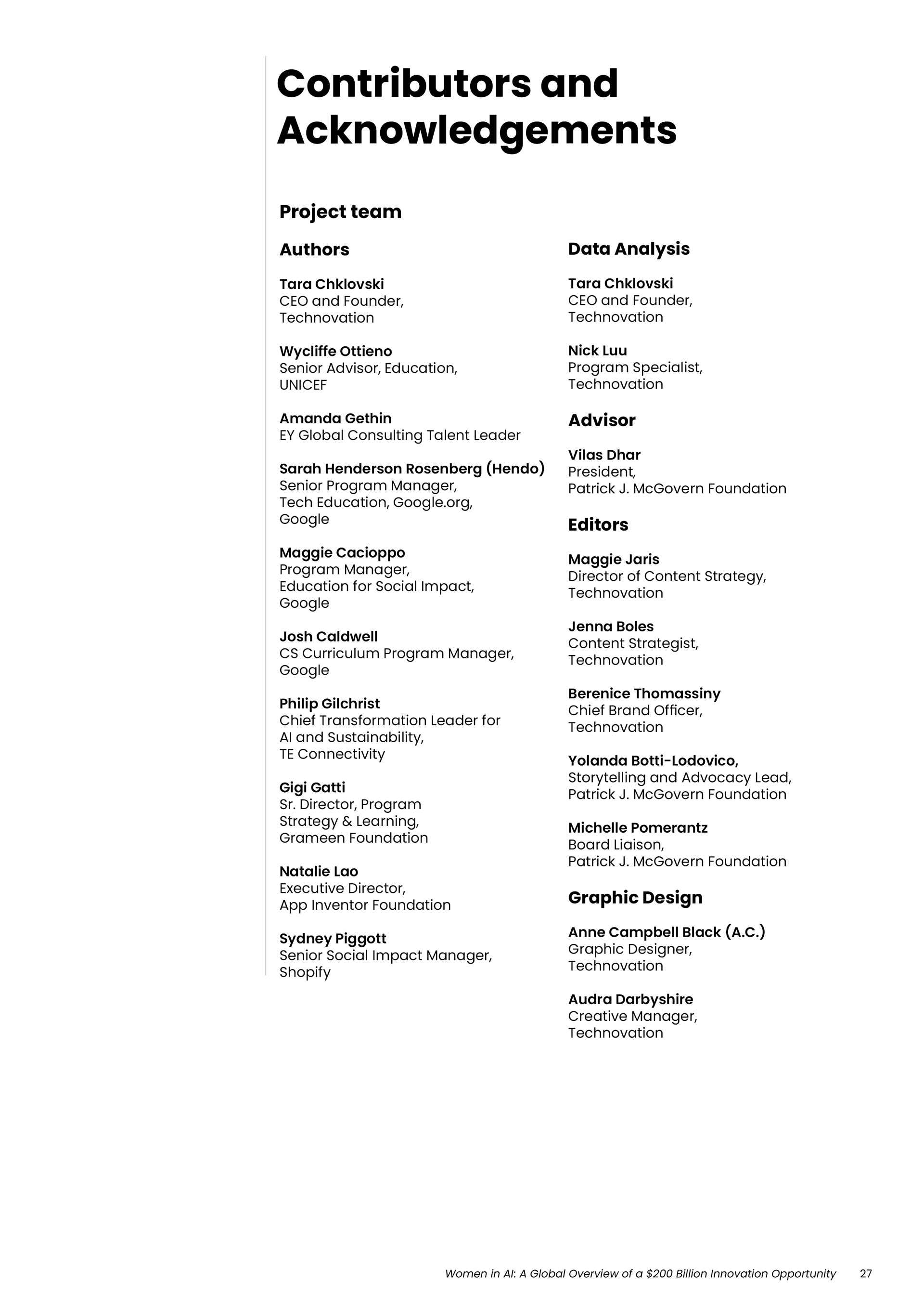 When Technovation asked me to design this report, the contributor list alone told me this wasn't a small ask. Google. UNICEF. EY. Shopify. Grameen Foundation. These weren't logos they were rooms full of people who'd spent time on this research. My job was to design something worthy of it, and with a 3 day turnaround.